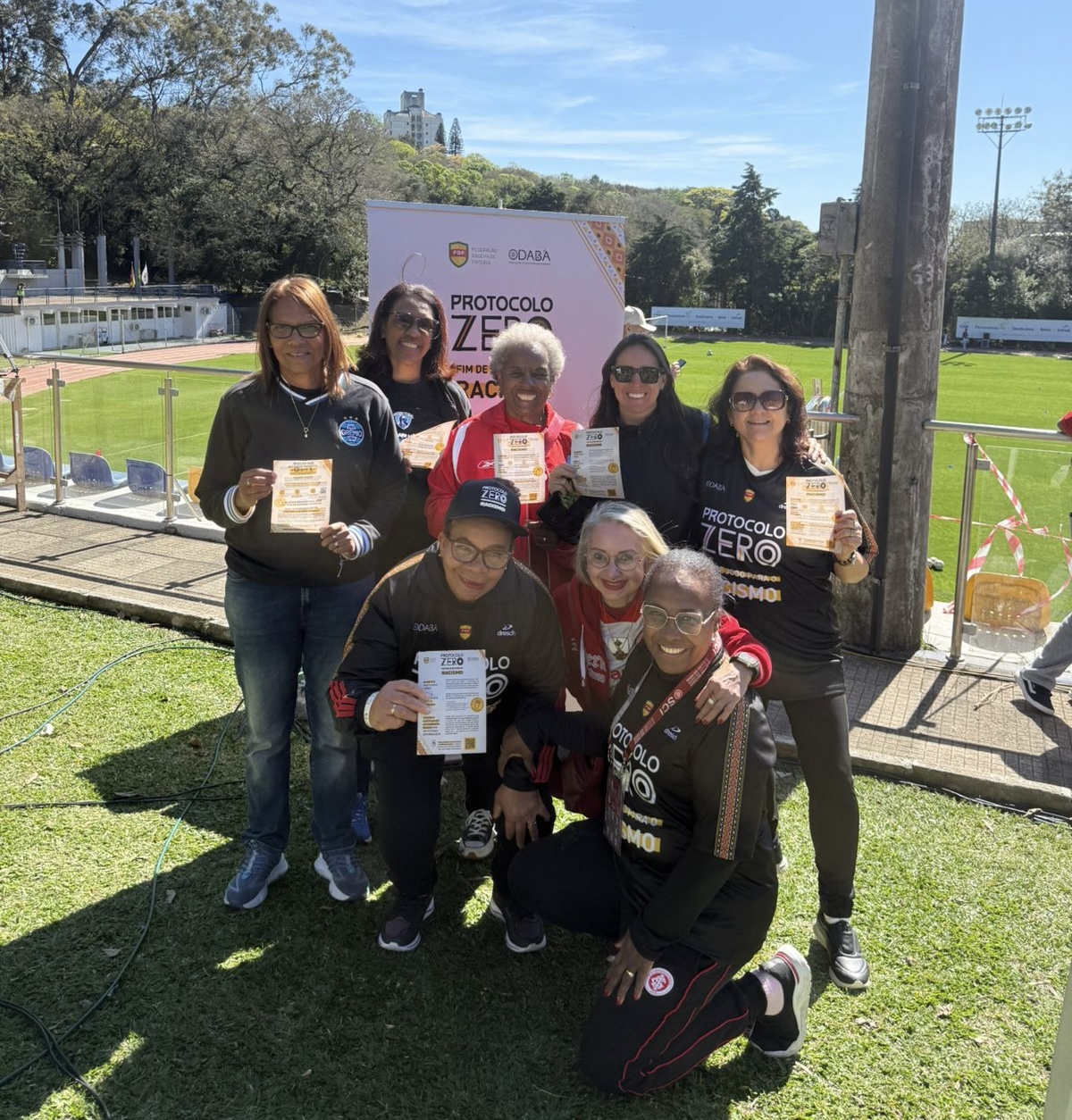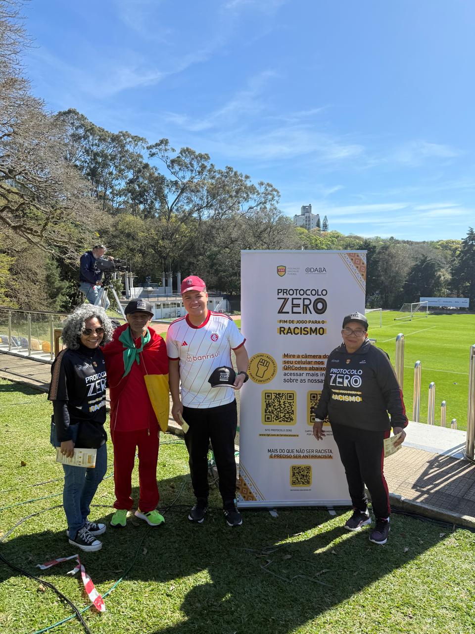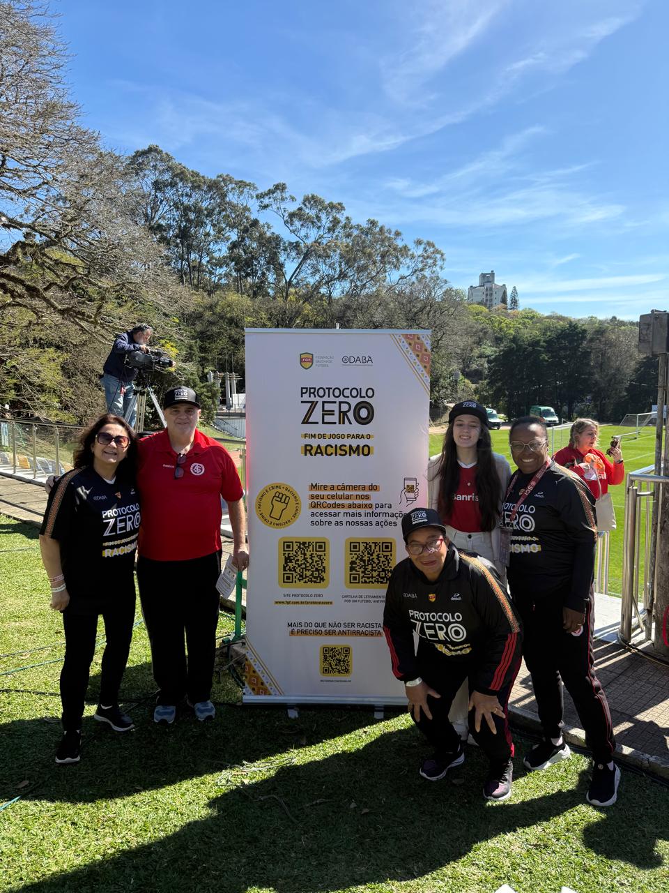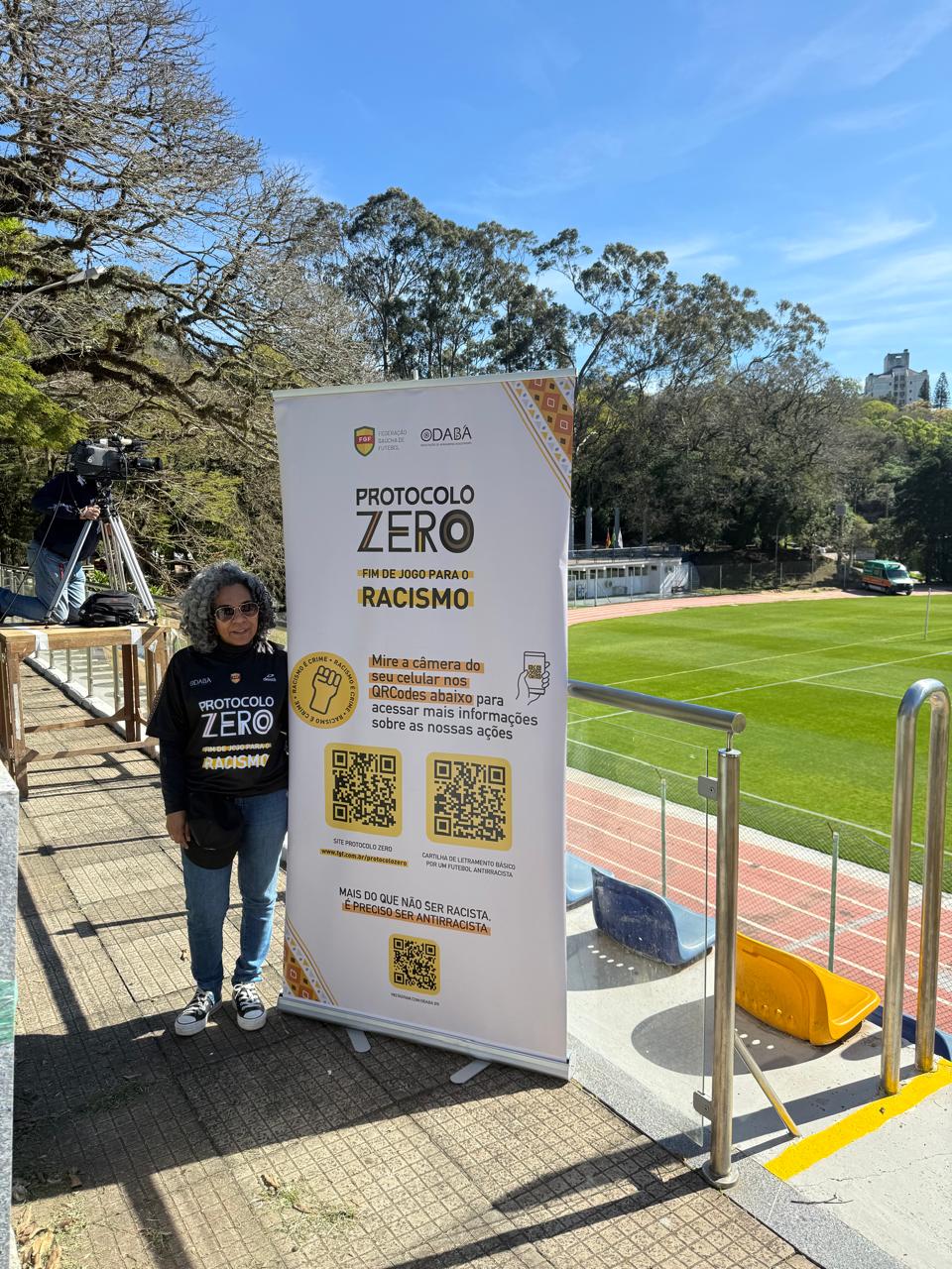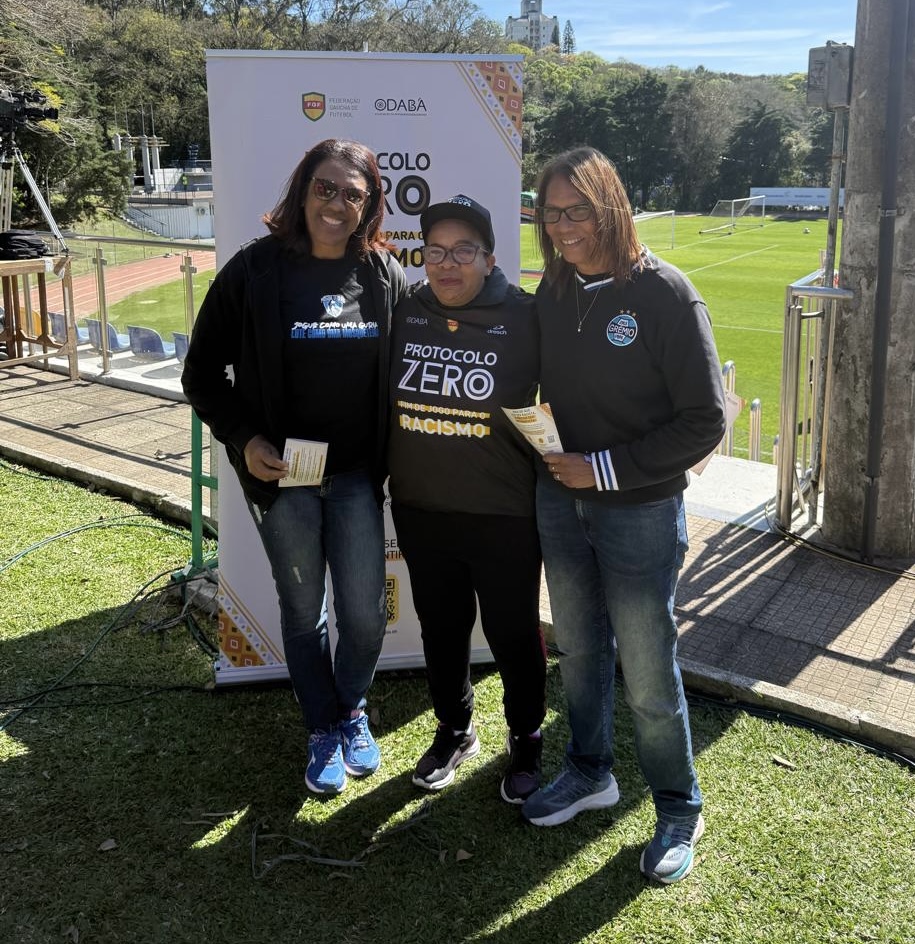 Em mais uma ação do projeto "Protocolo Zero: Fim de jogo para o Racismo" no Gauchão Feminino 2025, a Federação Gaúcha de Futebol - FGF, com o apoio da Odabá - Associação de Afroempreendedorismo, marcou presença no Gre-Nal Feminino de sábado (13), no SESC Protásio Alves, para conscientizar o público sobre o preconceito no futebol.