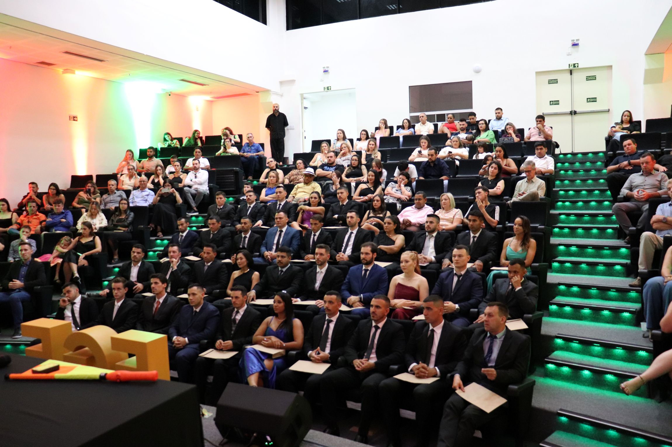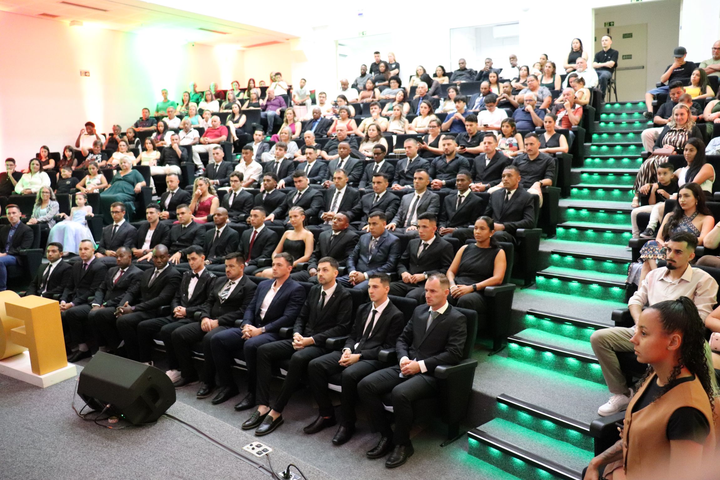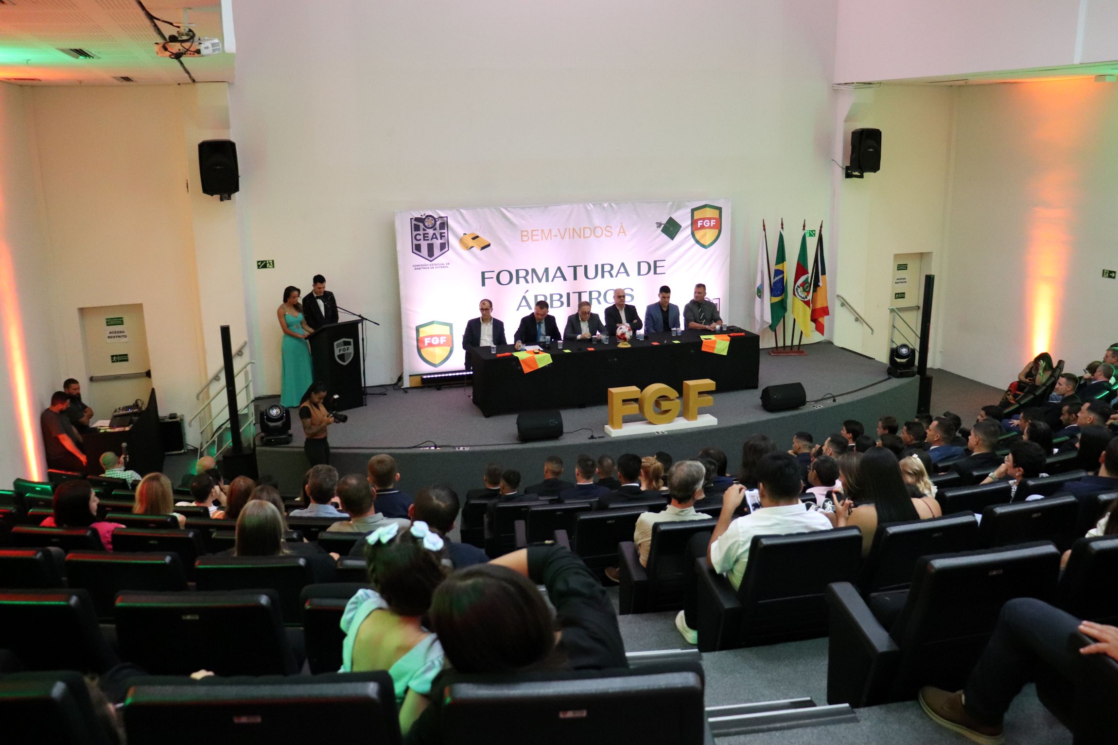 Turma Renato Marsiglia no auditório da FGF | Foto: Adão Paz Junior/FGFA Comissão Estadual de Árbitros de Futebol do Rio Grande do Sul - CEAF/RS formou 75 novos (as) árbitros (as) na noite deste sábado (21), em formatura realizada no auditório da Federação Gaúcha de Futebol - FGF, em Porto Alegre (RS). O evento contou com a presença ilustre do ex-árbitro Renato Marsiglia, homenageado pela turma, além do presidente da FGF, Luciano Hocsman. A mesa de autoridades foi composta ainda pelo presidente da CEAF, Leandro Vuaden, pelo coordenador da CEAF Daniel Soder, árbitro FIFA Rafael Klein e procurador do TJD/RS Renan Cardoso. O paraninfo foi o árbitro assistente Arthur Preissler.