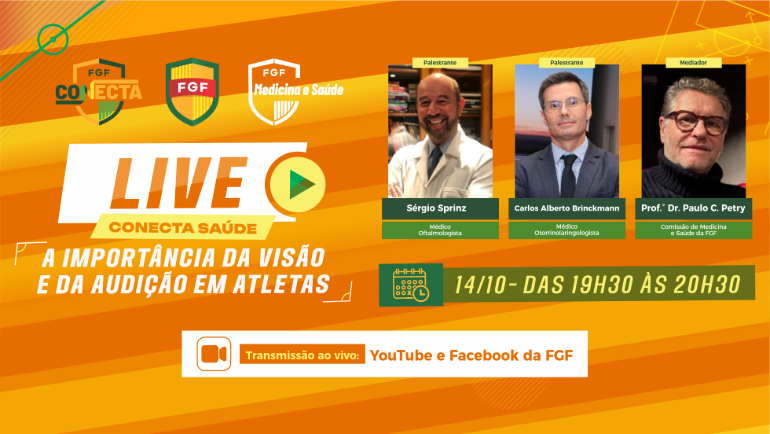 A importância da visão e da audição em atletas é o tema central da próxima live do projeto FGF Conecta, promovida pela Federação Gaúcha de Futebol - FGF. O debate virtual vai reunir o Médico Oftalmologista Sérgio Sprinz e o Médico Otorrinolaringologista Carlos Alberto Brinckmann, na próxima terça-feira (14), das 19h30min às 20h30min, com transmissão aberta no YouTube e Facebook da FGF. O mediador do encontro será o Professor Doutor Paulo C. Petry, membro da Comissão de Medicina e Saúde da FGF.