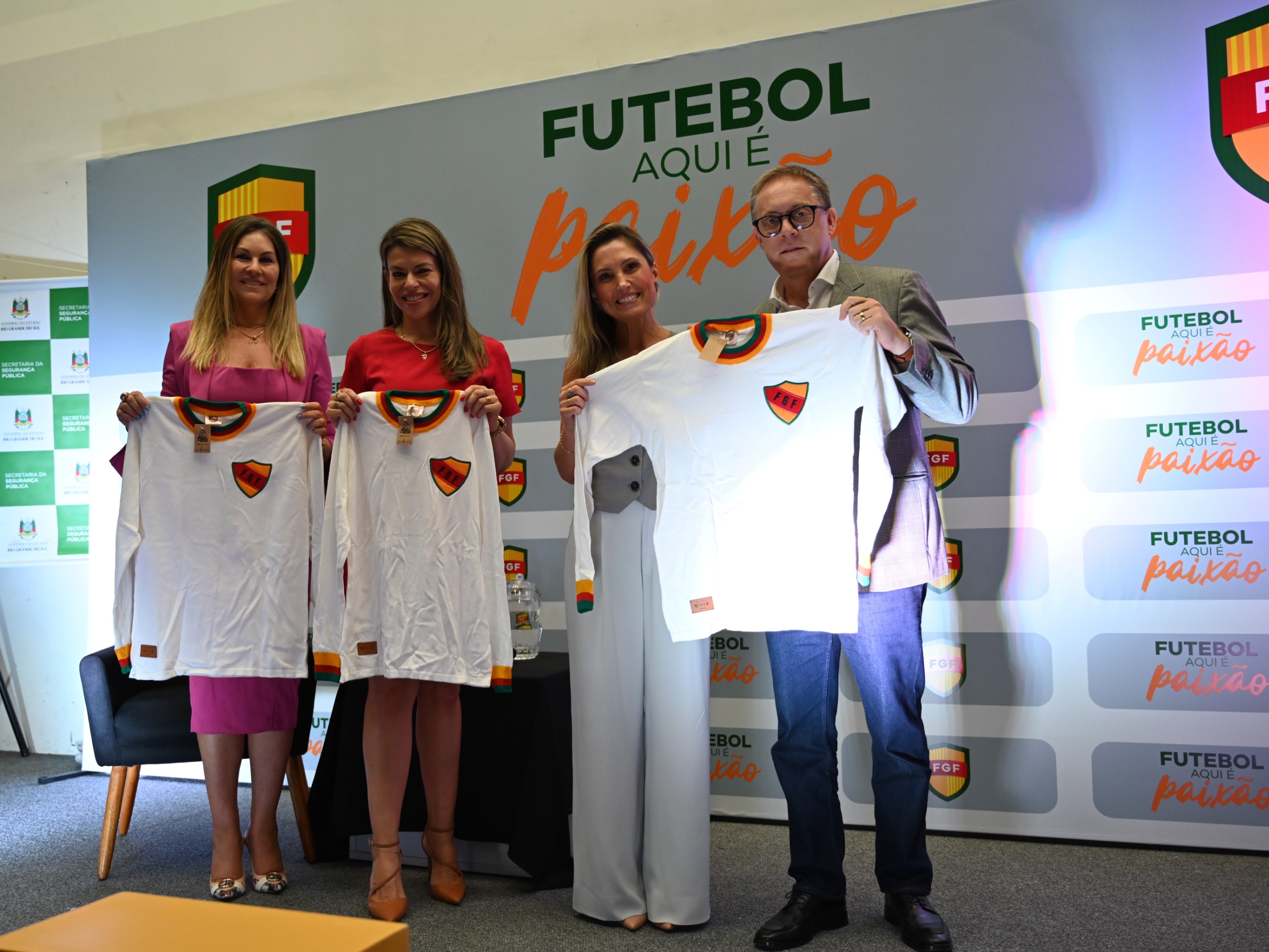 A Federação Gaúcha de Futebol - FGF realizou, na tarde desta segunda-feira (30), um ato simbólico de grande impacto social. O presidente da FGF, Luciano Hocsman, entregou à Secretária-adjunta da Segurança Pública, Adriana da Costa, as camisetas utilizadas por Grêmio e Internacional na grande final do Gauchão Superbet 2026. As peças levam estampada a marca da campanha "Ligue 181", focada no combate à violência contra a mulher.