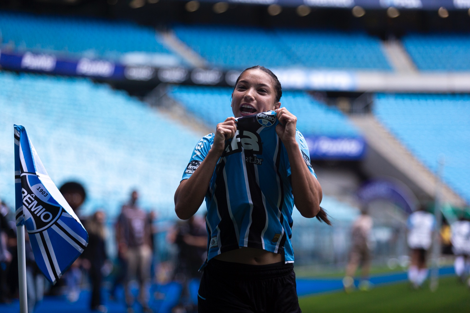 Após o ímpeto inicial, quando as Esmeraldas pouco ameaçavam o gol gremista, o equilíbrio tomou conta. Até que aos 41 minutos, as Mosqueteiras abriram o placar. Dani Barão avançou pelo lado direito e alçou a bola na área jaconera. Após corte parcial da defesa, Bia Santos pegou de primeira, de fora da área, e acertou o ângulo esquerdo da goleira Renata.