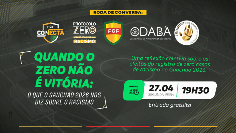 A Federação Gaúcha de Futebol - FGF promove no próximo dia 27 (segunda-feira) uma Roda de Conversa dos projetos FGF Conecta e Protocolo Zero com o objetivo de propor uma reflexão coletiva sobre os efeitos do registro de zero casos de racismo no último Campeonato Gaúcho. O evento será às 19h30min, no auditório da FGF, e terá como tema central a questão "Quando o zero não é vitória: o que o Gauchão 2026 nos diz sobre o racismo?"